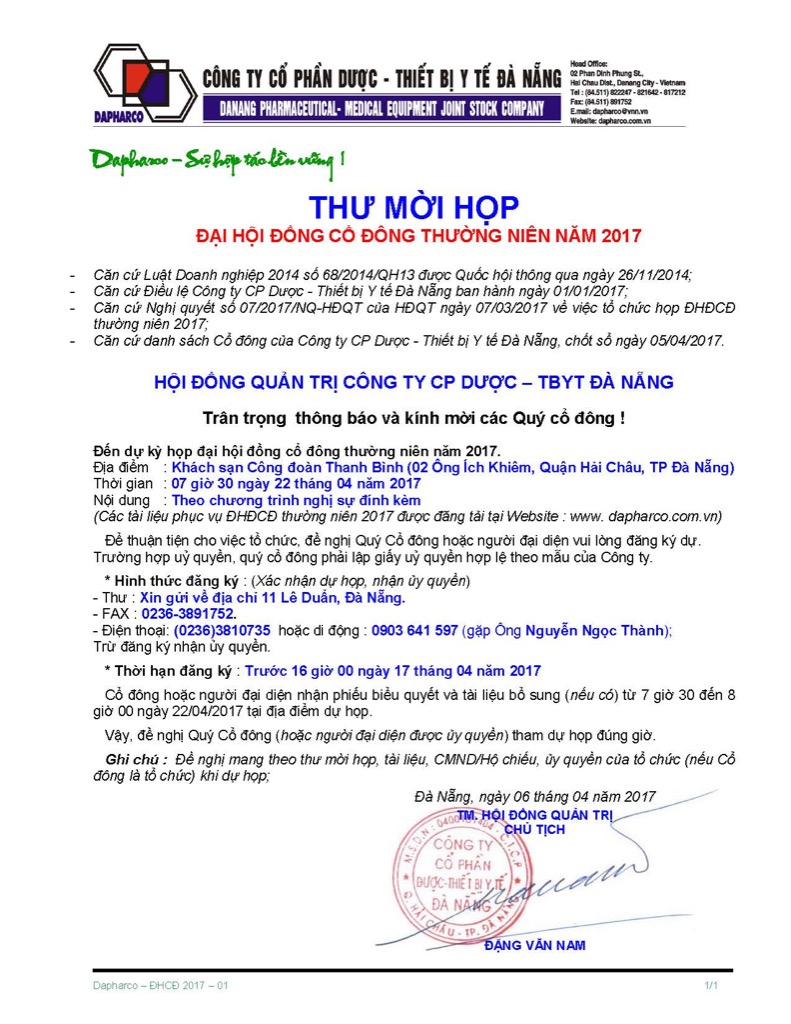 Thư mời và tài liệu Đại hội đồng cổ đông thường niên năm 2017 của Công ty cổ phần Dược – Thiết bị y tế Đà Nẵng (DAPHARCO) mã chứng khoán: DDN